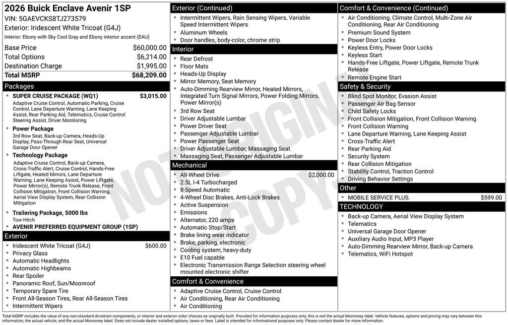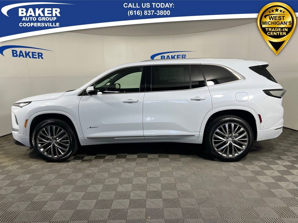 iridescent white tricoat 2026 Buick Enclave Avenir AWD 8-Speed Automatic 2.5L DOHC 16 Speakers, 3rd row seats: split-bench, 4-Wheel Disc Brakes, ABS brakes, Adaptive suspension, Air Conditioning, AM/FM radio: SiriusXM with 360L, Apple CarPlay/Android Auto, Auto High-beam Headlights, Auto tilt-away steering wheel, Auto-dimming door mirrors, Auto-dimming Rear-View mirror, Automatic temperature control, Bose Performance 16-Speaker Audio System with Subwoofer, Brake assist, Bumpers: body-color, Compass, Delay-off headlights, Driver 4-Way Power Lumbar Seat Adjuster, Driver 8-Way Power Seat Adjuster, Driver Attention Assist, Driver door bin, Driver Massage Control with 4-Way Power Lumbar, Driver vanity mirror, Dual front impact airbags, Dual front side impact airbags, Electronic Stability Control, Emergency communication system: OnStar and Buick connected services capable, Enhanced Automatic Parking Assist, Four wheel independent suspension, Front anti-roll bar, Front Bucket Seats, Front Center Armrest, Front dual zone A/C, Front Passenger 4-Way Power Lumbar Seat Adjuster, Front Passenger 6-Way Power Seat Adjuster, Front Passenger Massage Control with 4-Way Power Lumbar, Front reading lights, Fully automatic headlights, Garage door transmitter, Heads-Up Display, Heated door mirrors, Heated Driver and Front Passenger Seats, Heated front seats, Heated rear seats, Heated steering wheel, Illuminated entry, Leather steering wheel, Low tire pressure warning, Memory seat, Memory Settings, Mobile Service Plus, Navigation System, Occupant sensing airbag, Outside temperature display, Overhead airbag, Overhead console, Panic alarm, Passenger door bin, Passenger vanity mirror, Power door mirrors, Power driver seat, Power Liftgate, Power moonroof, Power passenger seat, Power steering, Power windows, Preferred Equipment Group 1SP, Premium audio system: Buick Infotainment System, Quilted and Perforated Leather-Appointed Seat Trim, Radio: Infotainment Center, Rain sensing wipers, Rear air conditioning, Rear anti-roll bar, Rear reading lights, Rear side impact airbag, Rear window defroster, Rear window wiper, Remote keyless entry, Security system, SiriusXM with 360L Trial Subscription, Speed-sensing steering, Steering wheel memory, Steering wheel mounted audio controls, Super Cruise, Super Cruise Package, Tachometer, Telescoping steering wheel, Tilt steering wheel, Traction control, Trip computer, Turn signal indicator mirrors, Variably intermittent wipers, Ventilated Driver and Front Passenger Seats, Ventilated front seats, Ventilated rear seats, Voltmeter, Wheels: 22 Alloy with Avenir Pearl Nickel Finish, Wireless Apple CarPlay, Wireless Google Android Auto.Recent Arrival! Price includes: $1000 - Bonus Cash. Exp. 03/02/2026 $500 - Purchase Allowance. Exp. 03/02/2026