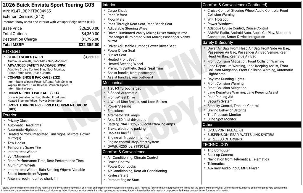 Ceramic White 2026 Buick Envista Sport Touring FWD 6-Speed Automatic ECOTEC 1.2L Turbo 4D Sport Utility, ECOTEC 1.2L Turbo, FWD, Ceramic White, Hih Ebony W/Whisper Beige Accents Artificial Leather, 2-Way Power Driver Lumbar Control, 8-Way Power Driver Seat Adjuster, Adaptive Cruise Control, Advanced Safety Package, All-Weather Floor Liners, Convenience I Package, Convenience II Package, Front Doors Keyless Open, Front Intermittent Rainsense Wipers, Heated Driver and Front Passenger Seats, Heated Steering Wheel, Lane Change Alert with Side Blind Zone Alert, Power Liftgate, Power Tilt-Sliding Moonroof with Manual Sunshade, Rear Cross Traffic Alert, Sport Pedal Kit, Studio Series, Watts Link System Rear Suspension, Wheels: 19 Black Painted Aluminum, Wireless Charging.