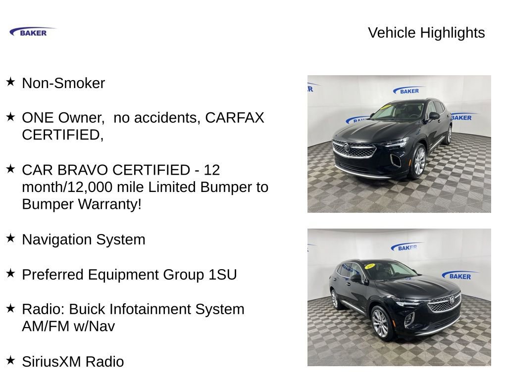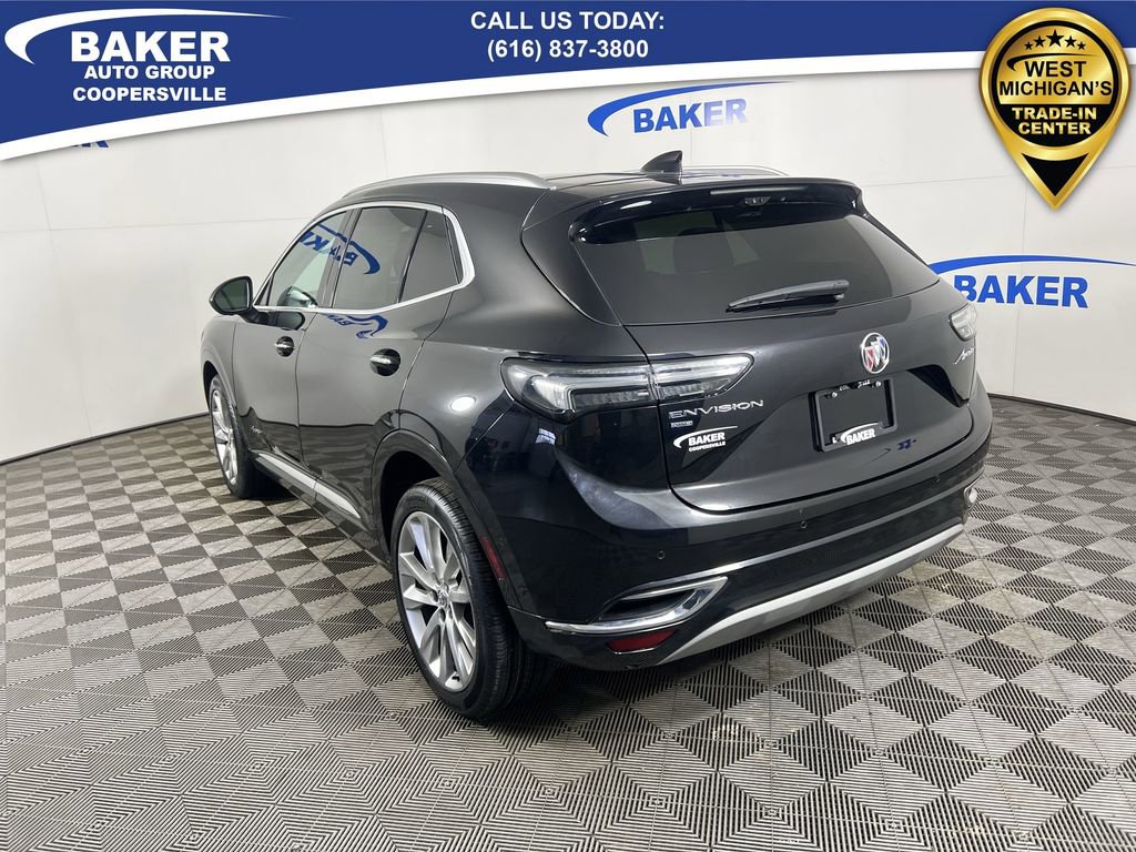 Ebony Twilight Metallic 2023 Buick Envision Avenir AWD 9-Speed Automatic 2.0L Turbocharged Non-Smoker, ONE Owner, no accidents, CARFAX CERTIFIED,, CAR BRAVO CERTIFIED - 12 month/12,000 mile Limited Bumper to Bumper Warranty!, Envision Avenir, 2.0L Turbocharged, 9-Speed Automatic, AWD, Ebony Twilight Metallic, Ebony Seats Leather, 8-Way Power Driver Seat Adjuster, Apple CarPlay/Android Auto, Automatic temperature control, Bose Premium 9-Speaker Audio System Feature, Exterior Parking Camera Rear, Front Bin Center Console USB Ports, Front dual zone A/C, Heads-Up Display, Heated front seats, Heated rear seats, Heated steering wheel, Lane Keep Assist w/Lane Departure Warning, Memory seat, Navigation System, Power driver seat, Power Liftgate, Power moonroof, Power passenger seat, Preferred Equipment Group 1SU, Radio: Buick Infotainment System AM/FM w/Nav, SiriusXM Radio, USB Charging-Only Ports, Ventilated front seats, Wheels: 20 Aluminum w/Avenir Pearl Nickel Finish, Wireless Apple CarPlay/Wireless Android Auto.