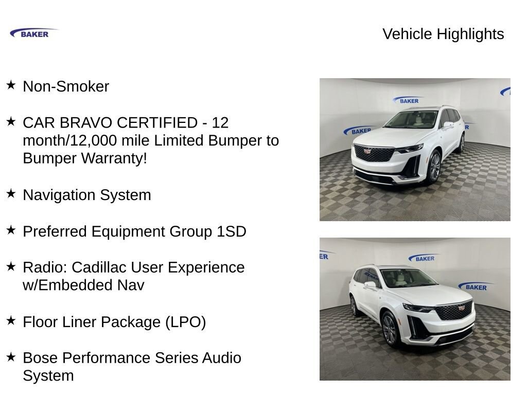 Crystal White Tricoat 2025 Cadillac XT6 Premium Luxury AWD 9-Speed Automatic 3.6L V6 DI VVT Non-Smoker, CAR BRAVO CERTIFIED - 12 month/12,000 mile Limited Bumper to Bumper Warranty!, XT6 Premium Luxury, 3.6L V6 DI VVT, 9-Speed Automatic, AWD, Cirrus Leather, 2-Way Power Driver Lumbar Control Seat Adjuster, 2-Way Power Passenger Lumbar Control Seat Adjuster, 6-Passenger Seating, 8-Way Power Driver Seat Adjuster, Automatic Emergency Braking, Automatic temperature control, Bose Performance Series Audio System, Floor Liner Package (LPO), Front & Rear Park Assist, Front dual zone A/C, Heated front seats, Heated rear seats, Inside Rear-View Auto-Dimming Mirror, Integrated Cargo Liner (LPO), Memory seat, Navigation System, Power driver seat, Power Liftgate, Power moonroof: UltraView, Power passenger seat, Preferred Equipment Group 1SD, Radio: Cadillac User Experience w/Embedded Nav, Ventilated front seats, Wheels: 20 6-Split Spoke Alloy, Wireless Apple CarPlay/Wireless Android Auto.