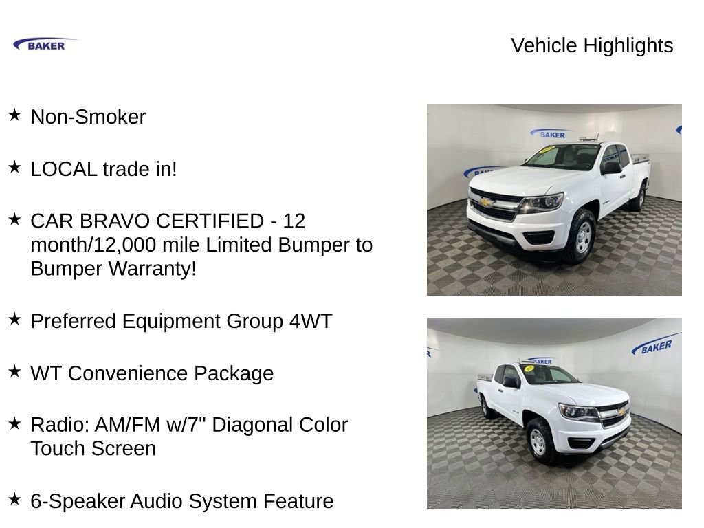 New Price! Summit White 2018 Chevrolet Colorado Work Truck 4WD 6-Speed Automatic 2.5L I4 DI DOHC VVT Non-Smoker, LOCAL trade in!, CAR BRAVO CERTIFIED - 12 month/12,000 mile Limited Bumper to Bumper Warranty!, Colorado Work Truck, 2.5L I4 DI DOHC VVT, 6-Speed Automatic, 4WD, Jet Black/Dark Ash w/Vinyl Seat Trim, 4.10 Rear Axle Ratio, 6-Speaker Audio System Feature, Air Conditioning, Apple CarPlay/Android Auto, Driver 4-Way Power Seat Adjuster, Electronic Automatic Cruise Control, Extended Range Remote Keyless Entry, Exterior Parking Camera Rear, EZ-Lift & Lower Tailgate, Preferred Equipment Group 4WT, Premium audio system: Chevrolet MyLink, Radio: AM/FM w/7 Diagonal Color Touch Screen, Rear step bumper, Unauthorized Entry Theft-Deterrent System, Wheels: 16 x 7 Ultra Silver Metallic Steel, WT Convenience Package.