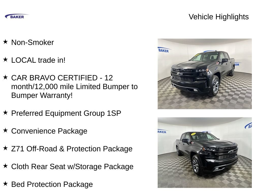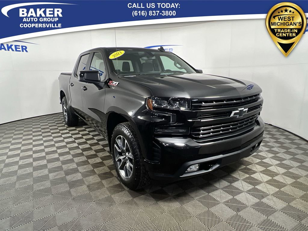 Mosaic Black Metallic 2021 Chevrolet Silverado 1500 RST 4WD 8-Speed Automatic EcoTec3 5.3L V8 Non-Smoker, LOCAL trade in!, CAR BRAVO CERTIFIED - 12 month/12,000 mile Limited Bumper to Bumper Warranty!, Silverado 1500 RST, EcoTec3 5.3L V8, 4WD, 10-Way Power Driver Seat w/Lumbar, 12-Volt Rear Auxiliary Power Outlet, 170 Amp Alternator, 2 USB Ports (First Row), 3.23 Rear Axle Ratio, 4.2 Diagonal Color Display Driver Info Center, 6-Speaker Audio System, All-Star Edition, Apple CarPlay/Android Auto, Auto-Locking Rear Differential, Bed Protection Package, Bluetooth® For Phone, Body Color Grille, Chevytec Spray-On Black Bedliner, Cloth Rear Seat w/Storage Package, Convenience Package, Deep-Tinted Glass, Dual-Zone Automatic Climate Control, Electric Rear-Window Defogger, Electrical Lock Control Steering Column, Electronic Cruise Control, EZ Lift Power Lock & Release Tailgate, Front Frame-Mounted Recovery Hooks, Front LED Fog Lamps, Heated front seats, Heated Steering Wheel, High Gloss Black Mirror Caps, Hitch Guidance, Integrated Trailer Brake Controller, Keyless Open & Start, LED Cargo Area Lighting, Manual Tilt/Telescoping Steering Column, OnStar & Chevrolet Connected Services Capable, Power Door Locks, Preferred Equipment Group 1SP, Rear 60/40 Folding Bench Seat (Folds Up), Rear Dual USB Charging-Only Ports, Rear Rubberized-Vinyl Floor Mats, Rear Vision Camera, Rear Wheelhouse Liners, Remote Vehicle Starter System, SiriusXM Radio, Standard Tailgate, Theft Deterrent System (Unauthorized Entry), Trailering Package, Wheels: 20 x 9 Painted Aluminum, Z71 Off-Road & Protection Package, Z71 Off-Road Package.