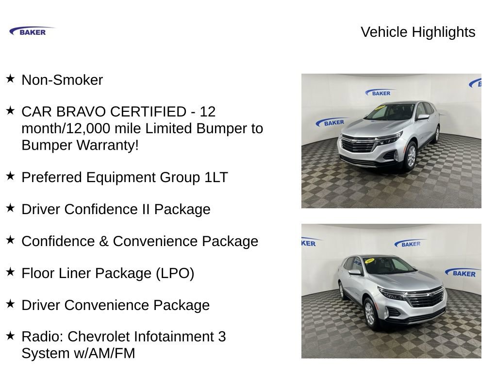 Silver Ice Metallic 2022 Chevrolet Equinox LT AWD 6-Speed Automatic Electronic with Overdrive 1.5L DOHC Non-Smoker, CAR BRAVO CERTIFIED - 12 month/12,000 mile Limited Bumper to Bumper Warranty!, Equinox LT, 1.5L DOHC, AWD, 17 Aluminum Wheels, 2 Rear USB Charging-Only Ports, 2 USB Ports & Auxiliary Input Jack, 2-Way Power Driver Lumbar Control Seat Adjuster, 6 Speaker Audio System Feature, 8-Way Power Driver Seat Adjuster, All-Weather Floor Liners (LPO), Bluetooth® For Phone, Confidence & Convenience Package, Driver Confidence II Package, Driver Convenience Package, Dual Zone Automatic Climate Control, Floor Liner Package (LPO), Front & Rear Park Assist, Front Passenger 4-Way Manual Seat Adjuster, Heated Driver & Front Passenger Seats, Integrated Cargo Liner (LPO), Lane Change Alert w/Side Blind Zone Alert, Power driver seat, Preferred Equipment Group 1LT, Radio: Chevrolet Infotainment 3 System w/AM/FM, Rear Power Liftgate.