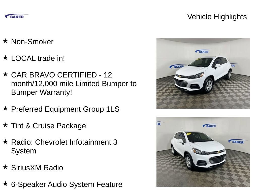 New Price! Summit White 2022 Chevrolet Trax LS FWD 6-Speed Automatic Turbo 1.4L VVT DOHC 4-Cylinder DI SIDI Non-Smoker, LOCAL trade in!, CAR BRAVO CERTIFIED - 12 month/12,000 mile Limited Bumper to Bumper Warranty!, Trax LS, Turbo 1.4L VVT DOHC 4-Cylinder DI SIDI, 6-Speed Automatic, FWD, Summit White, Black Cloth, 16 Aluminum Wheels, 2 USB Ports w/Auxiliary Input Jack, 2-Way Manual Front Passenger Seat Adjuster, 4-Way Manual Driver Seat Adjuster, 6-Speaker Audio System Feature, Apple CarPlay/Android Auto, Deep-Tinted Rear Glass Windows & Liftgate, Driver's Seat Mounted Armrest, Electronic Automatic Cruise Control, Exterior Parking Camera Rear, Preferred Equipment Group 1LS, Radio: Chevrolet Infotainment 3 System, SiriusXM Radio, Tint & Cruise Package.