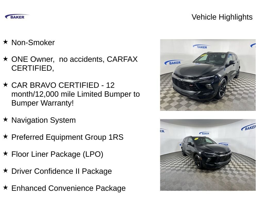 New Price! Black 2023 Chevrolet Blazer RS AWD 9-Speed Automatic with Overdrive 3.6L V6 SIDI Non-Smoker, ONE Owner, no accidents, CARFAX CERTIFIED,, CAR BRAVO CERTIFIED - 12 month/12,000 mile Limited Bumper to Bumper Warranty!, Blazer RS, 3.6L V6 SIDI, 9-Speed Automatic with Overdrive, AWD, Jet Black Leather, 6-Way Power Front Passenger Seat Adjuster, 8-Way Power Driver Seat Adjuster, Adaptive Cruise Control, Apple CarPlay/Android Auto, Bose Premium 8-Speaker Audio System Feature, Driver Confidence II Package, Enhanced Automatic Emergency Braking, Enhanced Convenience Package, Floor Liner Package (LPO), HD Surround Vision, Heated Driver & Front Passenger Seats, Heated Rear Outboard Seating Positions, Heated Steering Wheel, Integrated Cargo Liner (LPO), Memory Settings For Driver Seat & Exterior Mirrors, Navigation System, Power Driver Lumbar Control, Power driver seat, Power Liftgate, Power Panoramic Tilt-Sliding Sunroof, Power passenger seat, Preferred Equipment Group 1RS, Radio: Chevrolet Infotainment 3 Premium System, Rear Camera Mirror, Rear Park Assist w/Audible Warning, Safety Alert Seat, SiriusXM w/360L, Ventilated Driver & Front Passenger Seats, Wheels: 20 Gloss Black Aluminum.