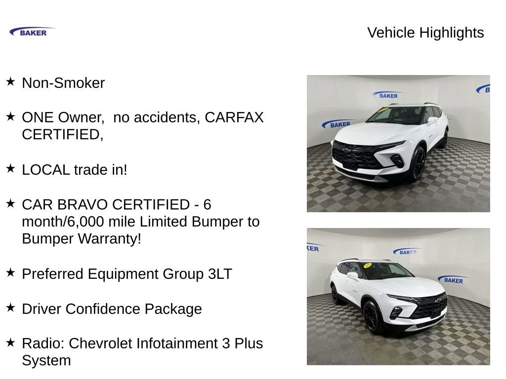 New Price! Summit White 2023 Chevrolet Blazer LT AWD 9-Speed Automatic with Overdrive 3.6L V6 SIDI Non-Smoker, ONE Owner, no accidents, CARFAX CERTIFIED,, LOCAL trade in!, CAR BRAVO CERTIFIED - 6 month/6,000 mile Limited Bumper to Bumper Warranty!, Blazer LT, 4D Sport Utility, 3.6L V6 SIDI, AWD, Summit White, Jet Black Leather, 6-Speaker Audio System Feature, 6-Way Power Front Passenger Seat Adjuster, 8-Way Power Driver Seat Adjuster, Apple CarPlay/Android Auto, Black Roof-Mounted Side Rails, Driver Confidence Package, Heated front seats, Inside Rear-View Auto-Dimming Mirror, Lane Change Alert w/Side Blind Zone Alert, Outside Heated Power-Adjustable Body-Color Mirrors, Power Driver Lumbar Control, Power driver seat, Power Liftgate, Power passenger seat, Preferred Equipment Group 3LT, Premium audio system: Chevrolet Infotainment 3 Plus, Radio: Chevrolet Infotainment 3 Plus System, Rear Cross Traffic Alert, Rear Park Assist w/Audible Warning, Rear Power Programmable Liftgate, SiriusXM w/360L, Universal Home Remote, Wheels: 18 Grazen Metallic Aluminum.