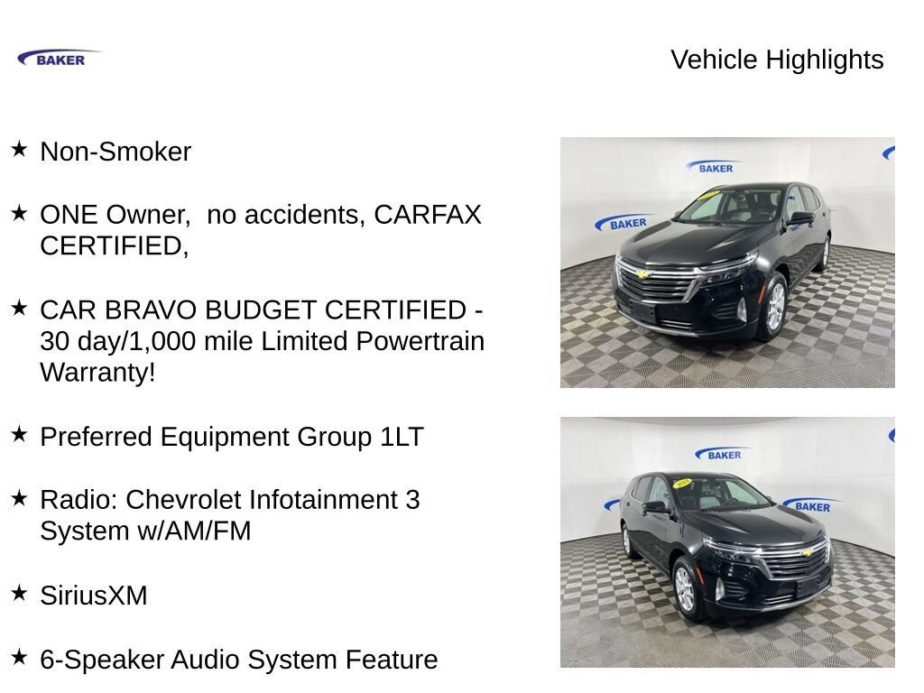 New Price! Mosaic Black Metallic 2024 Chevrolet Equinox LT AWD 6-Speed Automatic Electronic with Overdrive 1.5L DOHC Non-Smoker, ONE Owner, no accidents, CARFAX CERTIFIED,, CAR BRAVO BUDGET CERTIFIED - 30 day/1,000 mile Limited Powertrain Warranty!, Equinox LT, 1.5L DOHC, 6-Speed Automatic Electronic with Overdrive, AWD, Mosaic Black Metallic, Gray Cloth, 17 Aluminum Wheels, 2 Rear USB Charging-Only Ports, 2 USB Ports & Auxiliary Input Jack, 2-Way Power Driver Lumbar Control Seat Adjuster, 6-Speaker Audio System Feature, Air Conditioning, Automatic temperature control, Bluetooth® For Phone, Driver 8-Way Power Seat Adjuster, Front Passenger 4-Way Manual Seat Adjuster, Heated front seats, Power driver seat, Power Liftgate, Preferred Equipment Group 1LT, Radio: Chevrolet Infotainment 3 System w/AM/FM, SiriusXM.