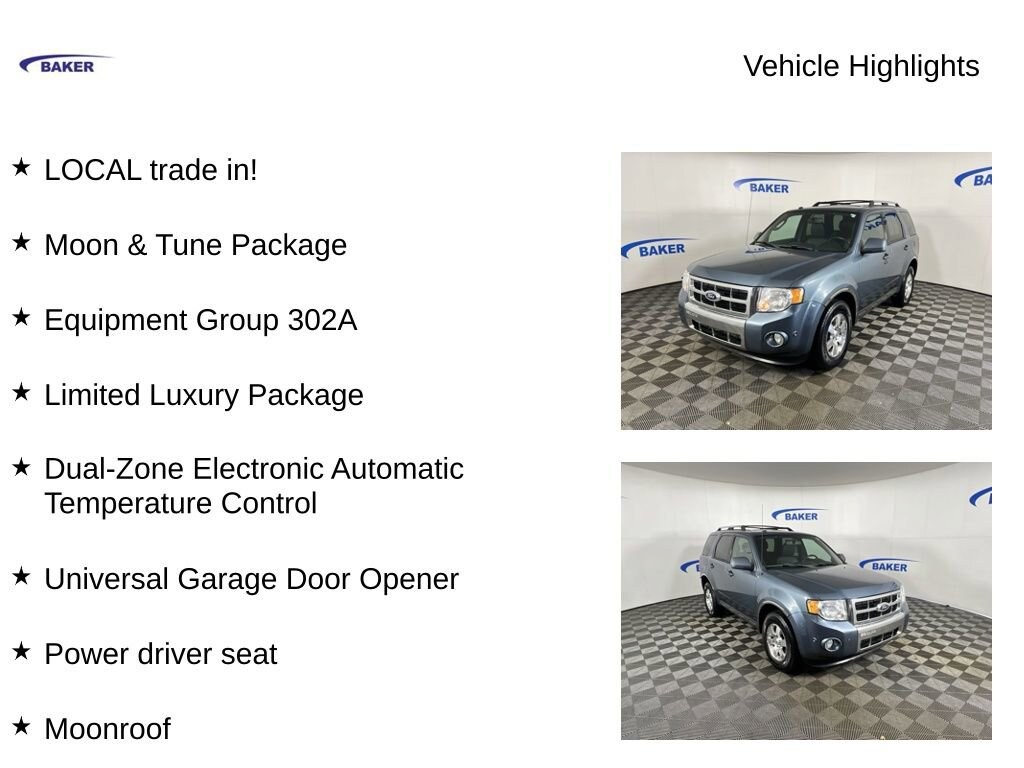 Steel Blue Metallic 2012 Ford Escape Limited FWD 6-Speed Automatic Duratec 2.5L I4 LOCAL trade in!, Escape Limited, Duratec 2.5L I4, FWD, Black Leather, 16 x 7 Bright Machined Aluminum Wheels, Auto Park, Dual-Zone Electronic Automatic Temperature Control, Equipment Group 302A, Leather Trimmed Heated Front Buckets, Limited Luxury Package, Moon & Tune Package, Moonroof, Power driver seat, Rear-View Camera, Reverse Sensing System, Universal Garage Door Opener.