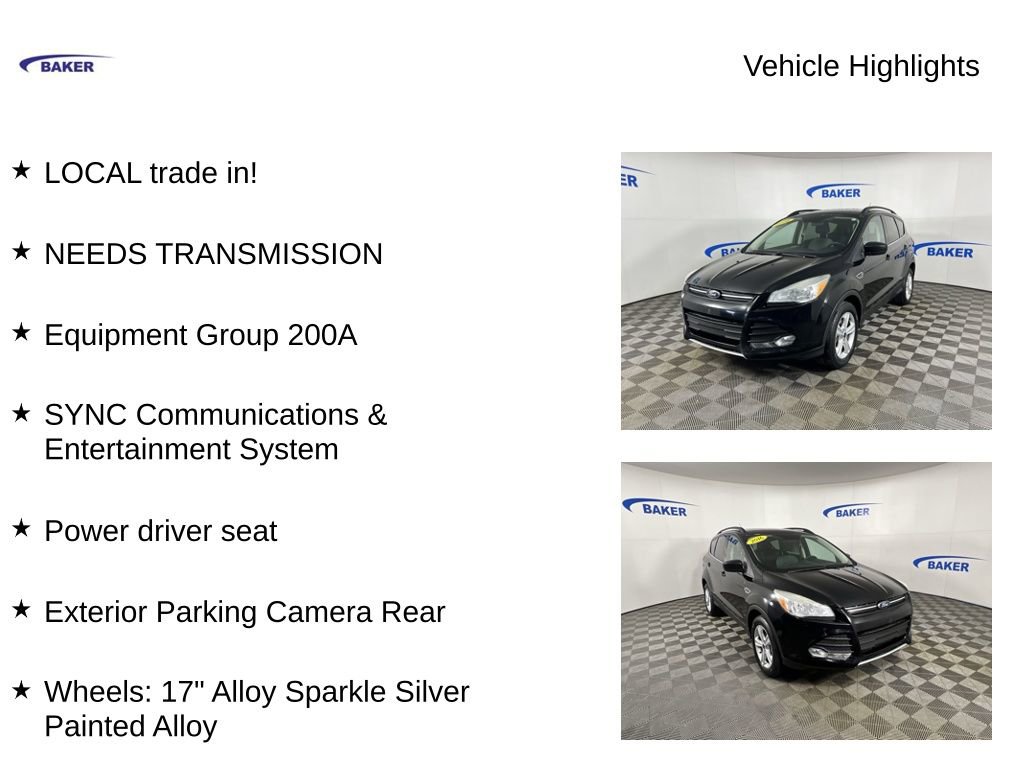 New Price! Shadow Black 2016 Ford Escape SE 4WD 6-Speed Automatic EcoBoost 1.6L I4 GTDi DOHC Turbocharged VCT LOCAL trade in!, NEEDS TRANSMISSION, Escape SE, EcoBoost 1.6L I4 GTDi DOHC Turbocharged VCT, 4WD, Charcoal Black w/Cloth Buckets w/60/40 Split Rear Seat, Equipment Group 200A, Exterior Parking Camera Rear, Power driver seat, SYNC Communications & Entertainment System, Wheels: 17 Alloy Sparkle Silver Painted Alloy.