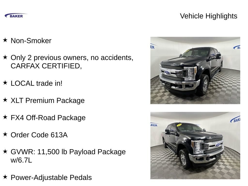 Shadow Black 2018 Ford F-350SD XLT 4WD TorqShift 6-Speed Automatic Power Stroke 6.7L V8 DI 32V OHV Turbodiesel Non-Smoker, Only 2 previous owners, no accidents, CARFAX CERTIFIED,, LOCAL trade in!, F-350 SuperDuty XLT, 4D Crew Cab, Power Stroke 6.7L V8 DI 32V OHV Turbodiesel, TorqShift 6-Speed Automatic, 4WD, Shadow Black, Medium Earth Gray Cloth, 3.55 Axle Ratio, 4.2 Center-Stack Screen, 6 Angular Chrome Step Bars, 8-Way Power Driver's Seat, Autolock/Auto Unlock, Body-Color Door Handles w/Chrome Insert, Chrome Exhaust Tip, Fog Lamps, FX4 Off-Road Package, GVWR: 11,500 lb Payload Package w/6.7L, Heated Driver & Passenger Seats, Hill Descent Control, Off-Road Specifically Tuned Shock Absorbers, Order Code 613A, Power-Adjustable Pedals, Reverse Sensing System, SecuriCode Driver's Side Keyless Entry Keypad, Unique Chrome Mirror Caps, Unique FX4 Off-Road Box Decal, Wheels: 18 Chrome PVD Aluminum, XLT Premium Package.CALL US TODAY 6168373800. Recent Arrival! Odometer is 40388 miles below market average!Awards:* 2018 KBB.com Brand Image Awards * 2018 KBB.com 10 Most Awarded Brands