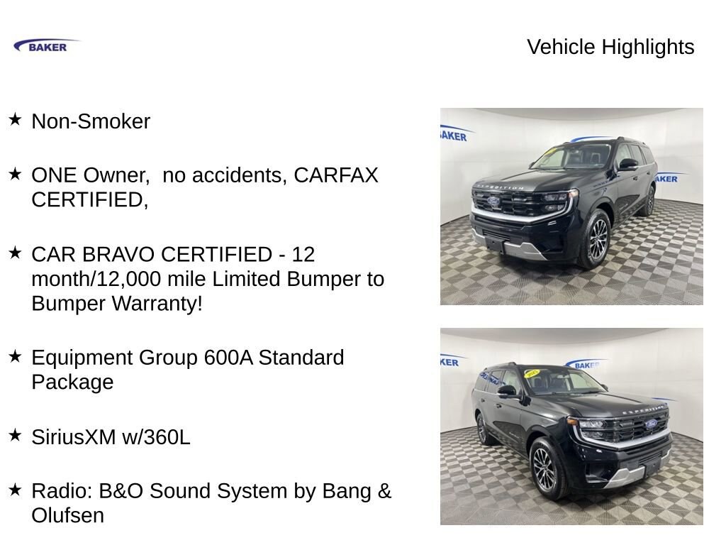 New Price! Agate Black Metallic 2025 Ford Expedition Platinum 4WD 10-Speed Automatic EcoBoost 3.5L V6 GTDi DOHC 24V Twin Turbocharged Non-Smoker, ONE Owner, no accidents, CARFAX CERTIFIED,, CAR BRAVO CERTIFIED - 12 month/12,000 mile Limited Bumper to Bumper Warranty!, Expedition Platinum, EcoBoost 3.5L V6 GTDi DOHC 24V Twin Turbocharged, 10-Speed Automatic, 4WD, Agate Black Metallic, Black Onyx Leather, 2nd Row Power-Folding Captain's Chairs, Adjustable pedals, Apple CarPlay/Android Auto, Equipment Group 600A Standard Package, Exterior Parking Camera Rear, Heated front seats, Heated rear seats, Heated steering wheel, Memory seat, Pedal memory, Power driver seat, Power moonroof: Vista Roof, Power passenger seat, Radio: B&O Sound System by Bang & Olufsen, SiriusXM w/360L, Ventilated front seats, Wheels: 20 Ebony Bright Machined Aluminum.