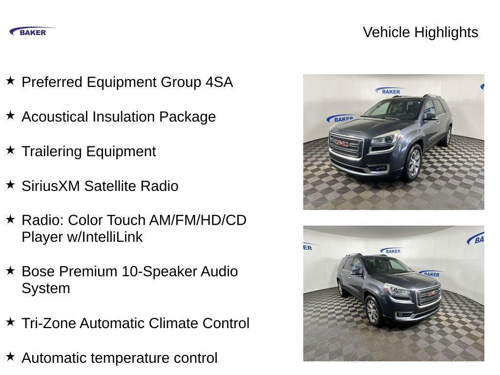 New Price! Cyber Gray Metallic 2013 GMC Acadia SLT-1 AWD 6-Speed Automatic 3.6L V6 SIDI Acadia SLT-1, 3.6L V6 SIDI, AWD, Ebony Leather, 19 x 7.5 Aluminum (4) Wheels, 2-Way Power Front Passenger Seat, 7-Passenger Seating (2-2-3 Seating Configuration), 8-Way Power Driver Seat, Acoustical Insulation Package, Automatic temperature control, Body-Color Bodyside Moldings, Body-Color Heated Power-Adjustable Outside Mirrors, Bose Premium 10-Speaker Audio System, Brake assist, Dual Downturn Tailpipe Exhaust, Exterior Parking Camera Rear, Heated front seats, Heavy-Duty Cooling System, Inside Rear-View Auto-Dimming Mirror, Integral Spotter Blind-Zone Mirrors, Leather-Wrapped Steering Wheel, Power driver seat, Power Liftgate, Power passenger seat, Preferred Equipment Group 4SA, Radio: Color Touch AM/FM/HD/CD Player w/IntelliLink, Remote Vehicle Start, SiriusXM Satellite Radio, Tilt & Telescopic Steering Column, Trailer Hitch, Trailering Equipment, Tri-Zone Automatic Climate Control, Universal Home Remote, Variable Effort Power Steering.CALL US TODAY 6168373800. Recent Arrival!Awards:* 2013 IIHS Top Safety PickReviews:* Compliant ride; seating for up to eight passengers; massive cargo area. Source: Edmunds* If you need room for eight, a massive cargo bay or some combination of both, but you donât want a fuel-thirsty full-size SUV or dowdy minivan, check out the 2013 GMC Acadia. Source: KBB.com