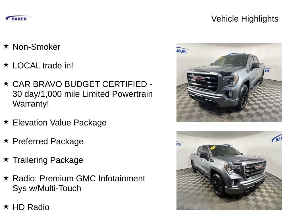 New Price! Satin Steel Metallic 2019 GMC Sierra 1500 Elevation 8-Speed Automatic EcoTec3 5.3L V8 Non-Smoker, LOCAL trade in!, CAR BRAVO BUDGET CERTIFIED - 30 day/1,000 mile Limited Powertrain Warranty!, Sierra 1500 Elevation, EcoTec3 5.3L V8, 8-Speed Automatic, Satin Steel Metallic, Jet Black w/Cloth Seat Trim, 12-Volt Rear Auxiliary Power Outlet, 120-Volt Instrument Panel Power Outlet, 2 USB Ports, 4-Way Manual Driver Seat Adjuster, Apple CarPlay/Android Auto, Electric Rear-Window Defogger, Elevation Value Package, Exterior Parking Camera Rear, Front Frame-Mounted Recovery Hooks, HD Radio, HD Rear Vision Camera, Heavy-Duty Rear Locking Differential, Power Sliding Rear Window w/Rear Defogger, Preferred Package, Premium Bose 7-Speaker Sound System, Radio: Premium GMC Infotainment Sys w/Multi-Touch, Rear window defroster, Trailering Package, Universal Home Remote, Wheels: 20 x 9 Black Gloss Painted Aluminum.