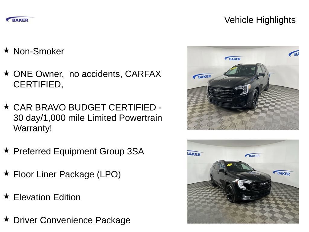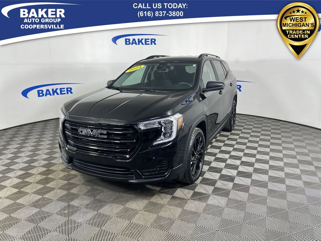 New Price! Ebony Twilight Metallic 2024 GMC Terrain SLE AWD 9-Speed Automatic 1.5L DOHC Non-Smoker, ONE Owner, no accidents, CARFAX CERTIFIED,, CAR BRAVO BUDGET CERTIFIED - 30 day/1,000 mile Limited Powertrain Warranty!, Terrain SLE, 1.5L DOHC, 9-Speed Automatic, AWD, Ebony Twilight Metallic, Jet Black Cloth, 2 USB Data Ports w/Auxiliary Input Jack, 4-Way Manual Driver's Seat, 4-Way Manual Front Passenger Seat, 6-Speaker Audio System Feature, 8-Way Power Driver Seat Adjuster, Auto-dimming Rear-View mirror, Black Mirror Caps, Bluetooth® For Phone, Darkened Front Grille, Driver & Front Passenger Heated Seats, Driver Convenience Package, Dual-Zone Automatic Climate Control, Elevation Edition, Floor Liner Package (LPO), Integrated Cargo Liner (LPO), Passenger door bin, Power Programmable Rear Liftgate, Preferred Equipment Group 3SA, Radio: GMC Infotainment Audio System w/7 Display, Remote Start, Roof-Mounted Luggage Rack Side Rails, SiriusXM, Wheels: 19 Gloss Black Aluminum, Wireless Apple CarPlay/Wireless Android Auto.