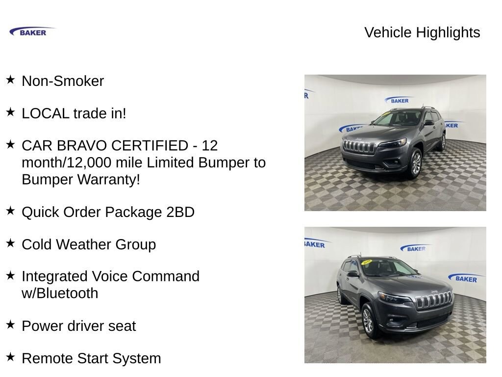 New Price! Granite Crystal Metallic Clearcoat 2019 Jeep Cherokee Latitude Plus 4WD 9-Speed 948TE Automatic 2.4L I4 Non-Smoker, LOCAL trade in!, CAR BRAVO CERTIFIED - 12 month/12,000 mile Limited Bumper to Bumper Warranty!, Cherokee Latitude Plus, 2.4L I4, 9-Speed 948TE Automatic, 4WD, Granite Crystal Metallic Clearcoat, Black Cloth, All-Season Floor Mats, Apple CarPlay/Android Auto, Cold Weather Group, Engine Block Heater, Heated Front Seats, Heated Steering Wheel, Integrated Voice Command w/Bluetooth, ParkView Rear Back-Up Camera, Power driver seat, Quick Order Package 2BD, Remote Start System, Wheels: 17 x 7 Satin Carbon Aluminum, Windshield Wiper De-Icer.