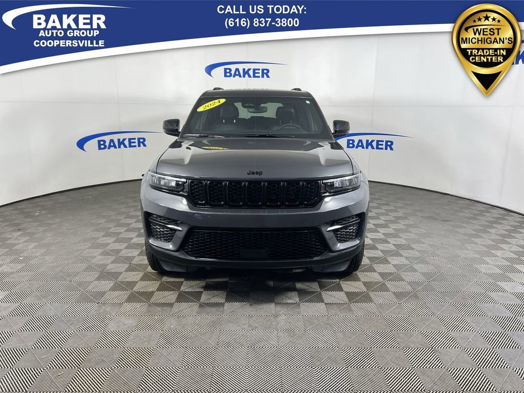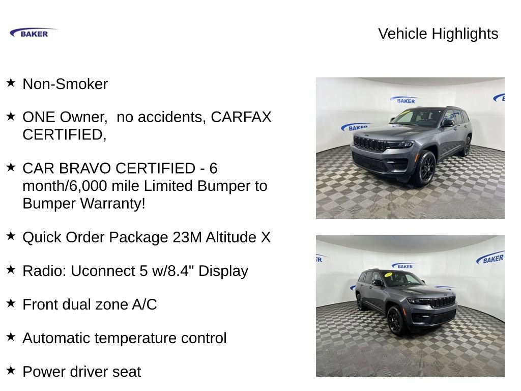 New Price! Baltic Gray Metallic Clearcoat 2024 Jeep Grand Cherokee Altitude X 4WD 8-Speed Automatic 3.6L V6 24V VVT Non-Smoker, ONE Owner, no accidents, CARFAX CERTIFIED,, CAR BRAVO CERTIFIED - 6 month/6,000 mile Limited Bumper to Bumper Warranty!, Grand Cherokee Altitude X, 3.6L V6 24V VVT, 8-Speed Automatic, 4WD, Baltic Gray Metallic Clearcoat, Global Black Artificial Leather, 115V Auxiliary Power Outlet, Altitude X, Automatic temperature control, Black Headliner, Capri Leatherette/Suede Seats, Front dual zone A/C, Gloss Black Exterior Accents, Heated Front Seats, Heated Steering Wheel, ParkView Rear Back-Up Camera, Power driver seat, Power Liftgate, Power Sunroof, Quick Order Package 23M Altitude X, Radio: Uconnect 5 w/8.4 Display, Rain Sensitive Windshield Wipers, Remote Start System, Selectable Tire Fill Alert, Wheels: 18 x 8 Fully Painted Aluminum 1, Wireless Charging Pad.