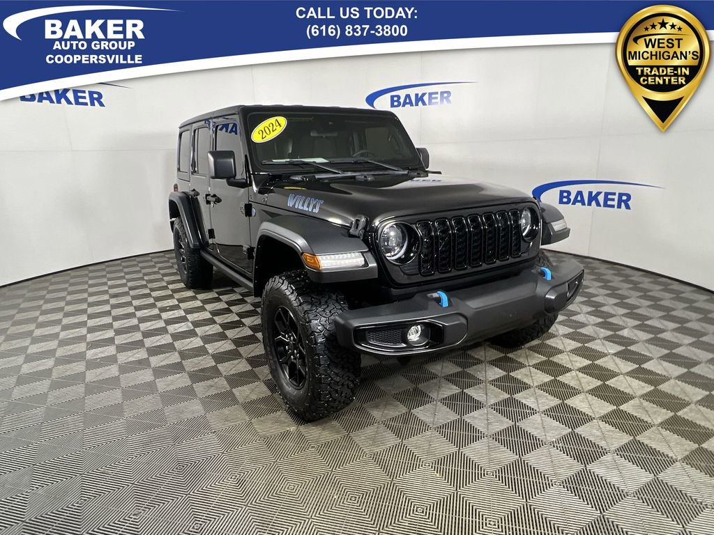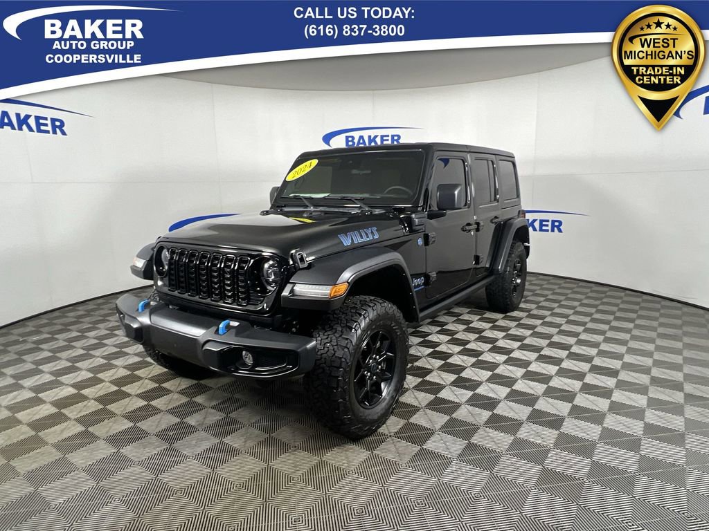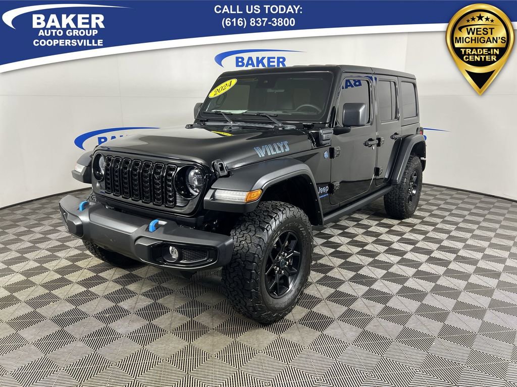 New Price! Black Clearcoat 2024 Jeep Wrangler Willys 4xe 4WD 8-Speed Automatic 2.0L I4 DOHC Non-Smoker, ONE Owner, no accidents, CARFAX CERTIFIED,, CAR BRAVO CERTIFIED - 12 month/12,000 mile Limited Bumper to Bumper Warranty!, Wrangler Willys 4xe, 4D Sport Utility, 2.0L I4 DOHC, 4WD, Black Clearcoat, Black Cloth, 2-Door Passive Entry, Front Door Locks, 4.10 Rear Axle Ratio, 4xe 4-Wheel Drive Swing Gate Decal, 7 & 4 Pin Wiring Harness, 97 MPH Vehicle Max Speed Calibration, Auxiliary Switches, Black Grille, Convenience Group, Conventional Differential Front Axle, E-Locker Rear Axle, Emergency/Assistance Call, Front LED Fog Lamps, Heated Front Seats, Heated Steering Wheel, LED Premium Reflector Headlamps, Molded in Color Rubicon Highline Flare, MOPAR All-Weather Floor Mats, Off-Road Plus Mode, Quick Order Package 29W Willys, Remote Start System, Universal Garage Door Opener, Wheels: 17 x 7.5 Painted Black, Willy's Suspension, Willys, Willys 4xe Hood Decal.