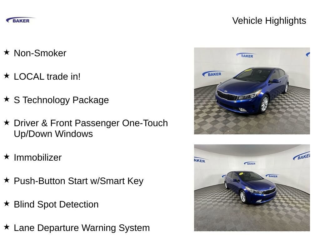 Deep Sea Blue 2017 Kia Forte S FWD 6-Speed Automatic 2.0L I4 DOHC Dual CVVT Non-Smoker, LOCAL trade in!, Forte S, 4D Sedan, 2.0L I4 DOHC Dual CVVT, FWD, Deep Sea Blue, Black Cloth, Autonomous Emergency Braking (AEB), Blind Spot Detection, Driver & Front Passenger One-Touch Up/Down Windows, Exterior Door Handles w/Chrome Inserts, Exterior Door Window Belt Line w/Chrome Molding, Front Collision Warning System, Front Fog Lights, Immobilizer, Lane Change Assist, Lane Departure Warning System, Lane Keep Assist, LED Taillights, Outside Mirrors w/ Turn Signal Indicator, Pedestrian Detection, Perimeter Approach Lighting, Power-Folding Outside Mirrors, Push-Button Start w/Smart Key, Rear Cross Traffic Alert (RCTA), S Technology Package, Supervision Meter Cluster.