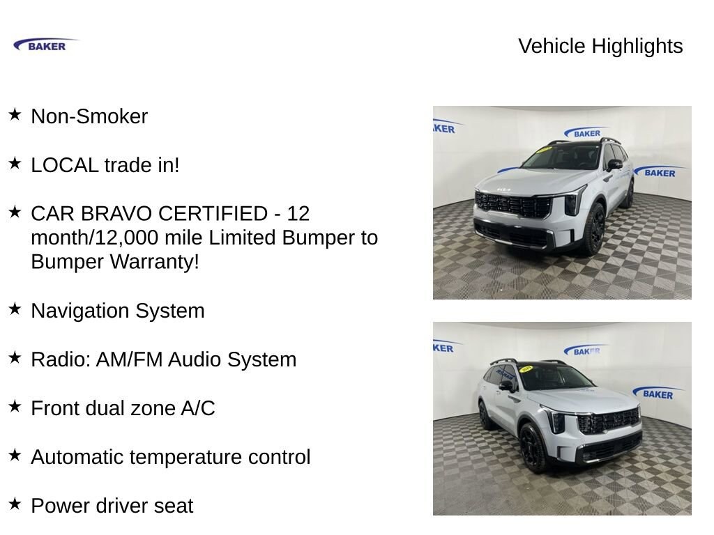 New Price! Wolf Gray 2024 Kia Sorento X-Line SX AWD 8-Speed DCT 2.5L I4 DGI Turbocharged DOHC 16V LEV3-SULEV30 281hp Non-Smoker, LOCAL trade in!, CAR BRAVO CERTIFIED - 12 month/12,000 mile Limited Bumper to Bumper Warranty!, Sorento X-Line SX, 2.5L I4 DGI Turbocharged DOHC 16V LEV3-SULEV30 281hp, 8-Speed DCT, AWD, Wolf Gray, Black Premium Synthetic, Apple CarPlay & Android Auto, Automatic temperature control, Exterior Parking Camera Rear, Front dual zone A/C, Heated front seats, Navigation System, Power driver seat, Power Liftgate, Power moonroof, Power passenger seat, Radio: AM/FM Audio System, SynTex Artificial Leather Seat Trim, Ventilated front seats, Wheels: 8.5J x 20 Gloss Black X-Line Alloy.