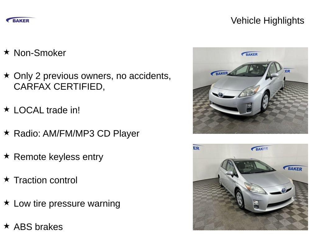 Classic Silver Metallic 2011 Toyota Prius Two FWD CVT 1.8L 4-Cylinder DOHC 16V VVT-i Non-Smoker, Only 2 previous owners, no accidents, CARFAX CERTIFIED,, LOCAL trade in!, Prius Two, 1.8L 4-Cylinder DOHC 16V VVT-i, FWD, Misty Gray w/Fabric Seat Trim, 15 x 6J Alloy Disc Wheels, ABS brakes, Electronic Stability Control, Heated door mirrors, Illuminated entry, Low tire pressure warning, Radio: AM/FM/MP3 CD Player, Remote keyless entry, Traction control.